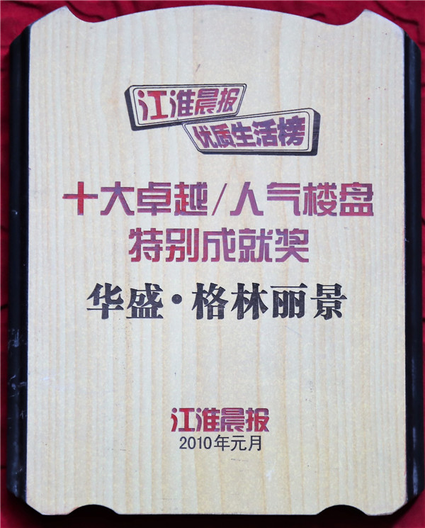 2010年度十大卓越、人气楼盘特别成就奖华盛格林丽景(江淮晨报)